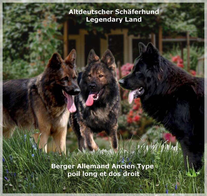 Trés occasionnellement , nous avons une portée de Bergers allemands ancien type qu'on nomme egalement Altdeutscher Schaferhund , ce sont des bergers allemands à poil long et au dos droit issus des anciennes lignées de travail de l'Allemagne de l'est . Nos reproducteurs ont été choisis pour leur bon caractere , leur capacité d'adaptation , leurs aptitudes à l'apprentissage. Ils peuvent evoluer autant dans des familles que dans le travail ou activités sportives.